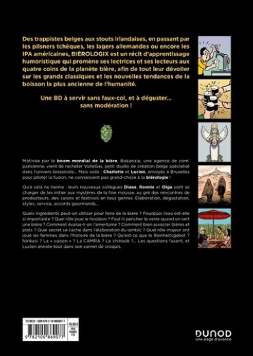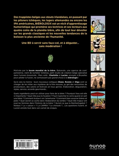 Des trappistes belges aux stouts irlandaises, en passant par les pilsners tchèques, les lagers allemandes ou encore les IPA américaines, Biérologix est un récit d'apprentissage humoristique qui promène ses lectrices et ses lecteurs aux quatre coins de la planète bière, afin de tout leur dévoiler sur les grands classiques et les nouvelles tendances de la boisson la plus ancienne de l'humanité. Une BD à servir sans faux-col, et à déguster... sans modération ! Motivée par le boom mondial de la bière, Bakanale, une agence de com' parisienne, vient de racheter VolleGas, petit studio de création belge spécialisé dans l'univers brassicole... Mais voilà : Charlotte et Lucien, envoyés à Bruxelles pour piloter la fusion, ne connaissent pas grand-chose à la biérologie ! Qu'à cela ne tienne : leurs nouveaux collègues Diane, Ronnie et Olga vont se charger de les initier aux mystères de la fine mousse, au gré des rencontres de producteurs, des salons et festivals en tous genres. Elaboration, dégustation, styles, service, accords gourmands... Quels ingrédients peut-on utiliser pour faire de la bière ? Pourquoi l'eau est-elle si importante ? Quel rôle joue le houblon ? Faut-il pencher le verre quand on sert une bière ? Comment évalue-t-on l'amertume ? Comment bien associer bières et plats ? Quel secret se cache dans l'élaboration du lambic ? Quel rôle majeur ont joué les femmes dans l'histoire de la bière ? Qu'est-ce que le Reinheitsgebot ? Ninkasi ? La "saison" ? La CAMRA ? Le chinook ? ... Les questions fusent, et Lucien annote tout dans son carnet de croquis.