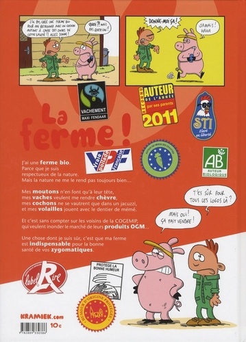 "Une chose dont je suis sûr, c'est que ma ferme est indispensable pour la bonne santé de vos zygomatiques. J'ai une ferme bio. Parce que je suis respectueux de la nature. Mais la nature ne me le rend pas toujours bien : mes moutons n'en font qu'à leur tête, mes vaches veulent me rendre chèvre, mes cochons ne se vautrent que dans un jacuzzi, et mes volailles jouent avec le dentier de mémé. Et c'est sans compter sur les voisins de la COGEMIP, qui veulent inonder le marché de leurs produits OGM..."