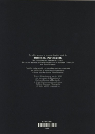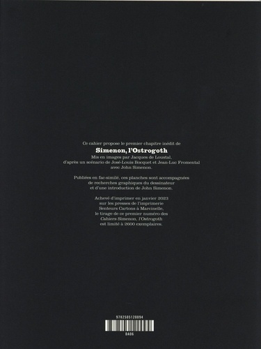 Ce cahier propose le premier chapitre inédit de Simenon, l'Ostrogoth Mis en images par Jacques de Loustal, d'après un scénario de José-Louis Bocquet et Jean-Luc Fromental avec John Simenon. Publiées en fac-similé, ces planches sont accompagnées de recherches graphiques du dessinateur et d'une introduction de John Simenon. Achevé d'imprimer en janvier 2023 sur les presses de l'imprimerie Senteurs Cartons à Marcinelle, le tirage de ce premier numéro des Cahiers Simenon, l'Ostrogoth est limité à 2600 exemplaires.