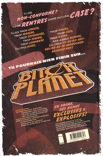Le futur. Le monde est gouverné par le diktat des hommes. Les femmes qui ne se plient pas aveuglément à leur volonté doivent être « rééduquées ». À l'issue d'un discours évangélisateur psalmodié en boucle dans leur sommeil, elles sont expédiées dans l'établissement auxiliaire de conformité, une prison pour femmes en orbite au-dessus de la Terre. Ces rebelles qui rejettent les règles masculines vont ainsi découvrir les joies de la vie carcérale dans cette boîte de métal que l'on appelle « Bitch Planet. »Entre pamphlet social, miroir de notre bonne vieille société patriarcale et récit d'aventure futuriste enlevé, Bitch Planet nous invite à découvrir un monde où les femmes se rebellent contre l'injustice et les disparités du consumérisme moderne. Un récit engagé en forme de coup de poing narratif et graphique, orchestré par la brillante Kelly Sue DeConnick (Pretty Deadly, Captain Marvel) et Valentine De Landro (X-Factor). En bonus à cette édition Glénat Comics : une couverture inédite, un appareil critique sur le féminisme et la culture populaire rédigé par Pia-Victoria Jacqmart, des interviews exclusives des auteurs, des fausses-pubs, et plein d'autres surprises !