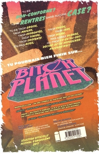 Dans le futur, le monde est gouverné par le diktat des hommes. Les femmes qui ne se plient pas aveuglément A leur volonté sont envoyées manu-militari dans l'établissement auxiliaire de conformité, une prison spatiale tournant en orbite autour de la Terre et répondant au doux nom de… BITCH PLANET ! Alors que les "bitches" doivent tout juste se remettre de la mort de Meiko, leur arme secrète lors du match de Mégaton, une enquête est lancée pour élucider son passé. Comment cette jeune ingénieure prometteuse a-t-elle pu basculer et devenir une véritable tueuse ?Dans la grande tradition des récits de SF engagés, Bitch Planet questionne sur les dérives du monde moderne, et notamment la place des femmes dans notre société. Un coup de poing narratif et graphique orchestré par Kelly Sue DeConnick et Valentine De Landro.
