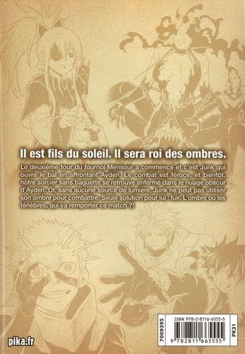 Il est fils du soleil. Il sera roi des ombres. Le deuxième tour du tournoi Mensour a commencé et c'est Junk qui ouvre le bal en affrontant Ayden. Le combat est féroce, et bientôt, notre sorcier sans baguette se retrouve enfermé dans le nuage obscur d'Ayden. Or, sans aucune source de lumière, Junk ne peut pas utiliser, son ombre pour combattre. Seule solution pour lui fuir. L'ombre ou les ténèbres qui va remporter ce match ?