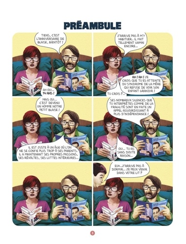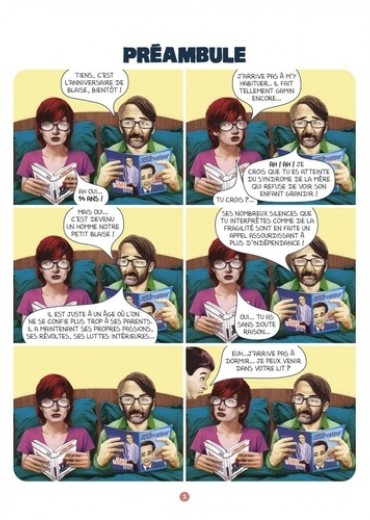 Tandis que la société tombe dans la dictature, tandis que ses parents s'habituent à tout, Blaise devient un adolescent. L'adolescence, contrairement à ce que promeuvent certains clichés romanesques, n'est pas l'âge de la rébellion et de la liberté. Il est surtout celui de l'adhésion à la masse. Et quelle masse ! Blaise revient, et Blaise est toujours victime de la mauvaise foi et de la bêtise. La société et ses parents font de Blaise un type pas très recommandable, mais en attendant, il nous fait rire et c'est le principal. Les collages de Dimitri Planchon font mouche, notamment parce qu'à notre corps défendant on s'y reconnaît un peu trop souvent... Laissez-vous sonner par cette série dont le premier opus, première pépite de la collection 1000 Feuilles, avait reçu un excellent accueil.