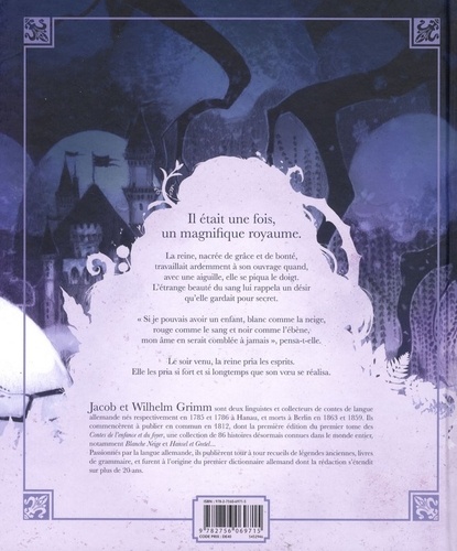Paru en 1812, ce très célèbre conte des frères Grimm se voit offrir un nouvel écrin digne de sa réputation. Une création très originale en 80 pages qui offre une vision nouvelle de Blanche Neige et des célèbres 7 nains. Il était une fois... En plein hiver, une reine qui cousait et qui, se piquant le doigt, émerveillée par ce sang sur cette neige qui tombait, laissa vagabonder son esprit, souhaitant avoir un enfant aussi blanc que la neige, aussi vermeil que le sang et aussi noir de cheveux que l'ébène. Bientôt, cette reine eut une petite fille qui répondit exactement à ses souhaits. Elle l'appela Blanche-Neige...