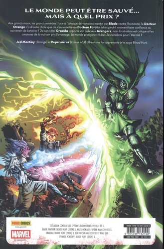 Aux grands maux, les grands remèdes. Face à l'attaque de vampires menée par Blade contre l'humanité, le Docteur Strange n'a d'autre choix que de s'en remettre au Docteur Fatalis. Mais peut-il vraiment faire confiance au souverain de Latvérie ? De son côté, Dracula apporte son aide aux Avengers, mais la situation est critique et les créatures de la nuit ont pris l'avantage. Le monde plongera-t-il dans les ténèbres pour l'éternité ? Jed MacKay (Strange) et Pepe Larraz (House of X) offrent une fin surprenante à la saga Blood Hunt.