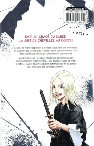 Face au chaos du sabre, la justice chevillée au corps ! Les Chi no risshi s'apprêtent à plonger Kyoto dans une mer de feu en allumant des incendies sur les sept ponts qui entourent la ville... Mais les Miburo veillent et l'affrontement commence ! Les adversaires de Harada, de Nagakura et de Hijikata sont particulièrement expérimentés... Pour protéger Kyoto et éviter la défaite, ils vont devoir redoubler d'efforts au point de perdre leur âme dans des combats acharnés !