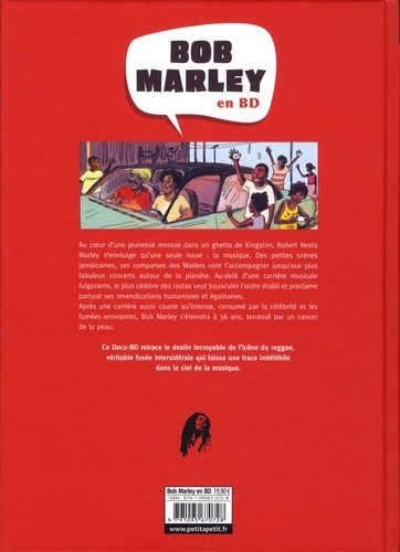 Au coeur d'une jeunesse morose dans un ghetto de Kingston, Robert Nesta Marley n'envisage qu'une seule issue : la musique. Des petites scènes jamaïcaines, ses comparses des Wailers vont l'accompagner jusqu'aux plus fabuleux concerts autour de la planète. Au-delà d'une carrière musicale fulgurante, le plus célèbre des rastas veut bousculer l'ordre établi et proclame partout ses revendications humanistes et égalitaires. Ce Docu-BD retrace le destin incroyable de l'icône du reggae, véritable fusée intersidérale qui laissa une trace indélébile dans le ciel de la musique.