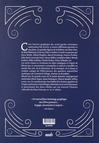 Cette histoire graphique des avant-gardes artistiques américaines fait revivre, à travers différents portraits et anecdotes, les grandes figures de la Bohème aux Etats-Unis, de Walt Whitman à Harvey Pekar et Robert Crumb en passant par Oscar Wilde. Alfred Stieglitz, Marcel Duchamp, Francis Picabia, John Reed, Gertrude Stein, Henry Miller, Joséphine Baker, Woody Guthrie, Billie Holiday. Charlie Parker, Dizzy Gillespie, etc. Les récits réunis ici revisitent les idées utopiques et l'esprit de liberté que ce mouvement cosmopolite et radical a insuffles au monde des arts, de la littérature, de la musique. de la danse et rendent compte de l'effervescence des quartiers aujourd'hui mythiques de Greenwich Village. Harlem ou Brooklyn. Illustré par les grands noms de la bande dessinée underground américaine (Peter Kuper. Spain Rodriguez. Sharon Rudahl, Jeffrey Lewis. etc.) et coordonné par Paul Buhle (Une histoire populaire de l'empireaméricain)et David Berger, Bohemians est le récit foisonnant et passionnant des élans rebelles qui ont traversé l'histoire culturelle des Etats-Unis aux XIXe et XXe siècles.