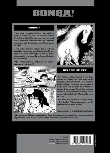 Otani est un élève malheureux, maltraité par tout le monde. Pourtant il a un rayon de soleil dans sa vie, sa professeure, Reiko Mizushima, dont il est amoureux. C'est certain, un jour, il l'épousera ! Il a aussi un secret. Il a fait ainsi la connaissance de Bomba, un cheval fantomatique, qui semble s'intéresser à lui. Comble de la catastrophe, le professeur Onikashira, qu'il déteste le plus, demande la Professeure en mariage. Otani enrage, et, dans une supplique, demande à Bomba de s'en débarrasser. Le lendemain, Onikashira est retrouvé mort, noyé par accident ... Coïncidence ? Ce volume de la Collection Osamu Tezuka's Dark Anthology contient 3 histoires inédites, Bomba ! , La Mélodie du Métal et Hallucinations Blanches.