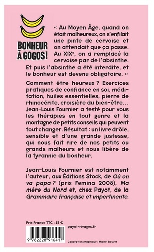 "Au Moyen Age, quand on était malheureux, on s'enfilait une pinte de cervoise et on attendait que ça passe. Au XIXe, on a remplacé la cervoise par de l'absinthe. Et puis l'absinthe a été interdite, et le bonheur est devenu obligatoire." Comment être heureux ? Exercices pratiques de confiance en soi, méditation, huiles essentielles, pierre de rhinocérite, croisière du bien-être... Jean-Louis Fournier a testé pour vous les thérapies en tout genre et la montagne de petits conseils qui peuvent tout changer. Résultat : un livre drôle, sensible et d'une grande justesse, qui nous fait rire de nos petits ou grands malheurs et nous libère de la tyrannie du bonheur.