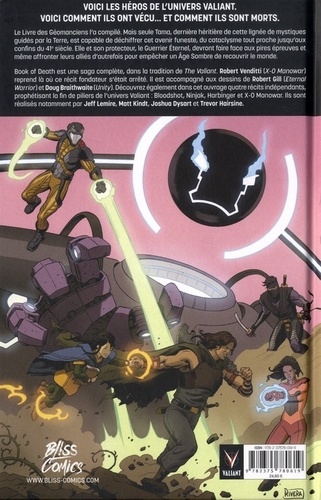 Voici les héros de l'univers Valiant. Voici comment ils ont vécu... et comment ils sont morts. Le Livre des Géomanciens l'a compilé. Mais seule Tama, dernière héritière de cette lignée de mystiques guidés par la Terre, est capable de déchiffrer cet avenir funeste, du cataclysme tout proche jusqu'aux confins du 41e siècle. Elle et son protecteur, le Guerrier Eternel, devront faire face aux pires épreuves et même affronter leurs alliés d'autrefois pour empêcher un Age Sombre de recouvrir le monde. Book of Death est une saga complète, dans la tradition de The Valiant. Robert Venditti (X-O Manowar) reprend là où ce récit fondateur s'était arrêté. II est accompagné aux dessins de Robert Gill (Eternal Warrior) et Doug Braithwaite (Unity). Découvrez également dans cet ouvrage quatre récits indépendants, prophétisant la fin de piliers de l'univers Valiant : Bloodshot, Ninjak, Harbinger et X-O Manowar. Ils sont réalisés notamment par Jeff Lemire, Matt Kindt, Joshua Dysart et Trevor Hairsine.