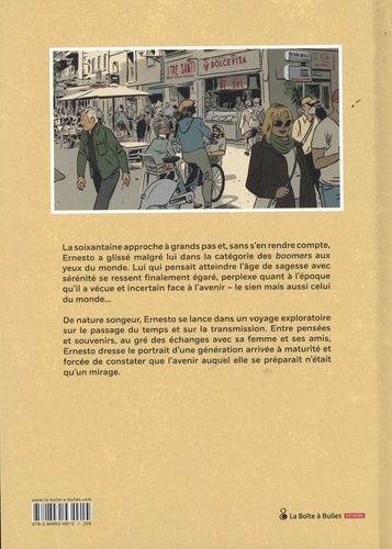 Ernesto est à l'aube de la soixantaine et, s'il écoutait un peu plus les autres, il se verrait déjà un pied dans la tombe. Lui qui se réjouissait d'atteindre l'âge de sagesse se retrouve égaré, perplexe quant à son époque et incertain face à l'avenir - le sien mais aussi celui du monde... De nature songeur, Ernesto se lance dans un voyage exploratoire sur le passage du temps et sur la transmission. Entre pensées et souvenirs, nourri des échanges avec sa femme et ses amis, se dessine en filigrane le portrait d'une génération arrivée à maturité et forcée de constater que l'avenir auquel elle se préparait n'était qu'un mirage. Boomers est un album qui bouscule à pas feutrés, qui encourage à la résilience, et porte un regard nostalgique mais dénué d'amertume sur le monde moderne et sur son devenir.