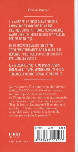 Il y a une seule chose qui me console. L'avantage d'avoir plus de 40 ans, c'est que l'on a fait toutes nos conneries avant l'ère d'internet, donc il n'y a aucune preuve de tout ça. Un de mes potes m'a dit que j'étais totalement immature. Ce à quoi je lui ai répondu : "c'est celui qui le dit qui l'est ! " paf, dans les dents ! Il y a encore 5 ans, je me disais "Je suis génial au lit" mais, maintenant, j'ai plutôt tendance a me dire "Génial, je suis au lit". Journal intime d'un homme qui doit devenir adulte, Bordel de merde, j'ai 40 ans ! retrace une année pleine de rebondissements et d'humour chez un tout jeune quarantenaire. Les réunions copro ? Un ennui. Les gosses ? Trop de bruits ! Les impôts ? Il est trop tard pour fuir... Cynisme et absurdités sont au rendez-vous : prendre de la bouteille, ce n'est pas toujours la panacée !