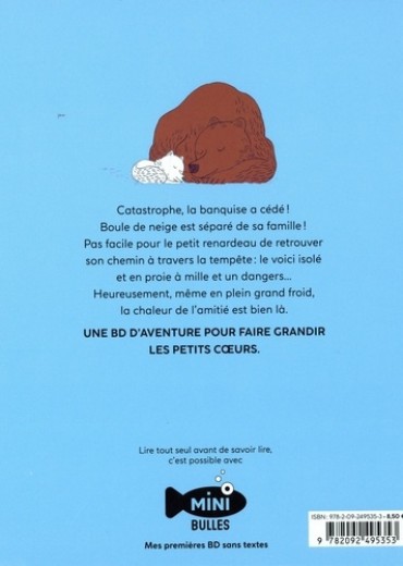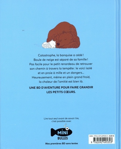 Lire tout seul avant de savoir lire, c'est possible avec Mini Bulles. Des premières BD à découvrir dès 3 ans : une BD sans texte conçue pour les petits. Les petits entrent naturellement dans les livres par les images : sans le soutien du texte, les images portent toutes les étapes du récit sans ellipse narrative. Sans texte, chacun est libre de se raconter l'histoire comme il le souhaite : à partir des images, l'enfant passe à l'oral et fait des phrases pour vous raconter l'histoire ou lire tout seul. Dans cette histoire : Catastrophe, la banquise a cédé ! Boule de neige est séparé de sa famille ! Pas facile pour le petit renardeau de retrouver son chemin à travers la tempête : le voici isolé et en proie à mille et un dangers... Heureusement, même en plein grand froid, la chaleur de l'amitié est bien là. Une BD d'aventure pour faire grandir les petits coeurs, à découvrir dès 3 ans. Dans chaque BD, un volet dépliant "Suivez-le guide" pour accompagner les parents et vous donner les clefs d'entrées dans une BD sans texte.