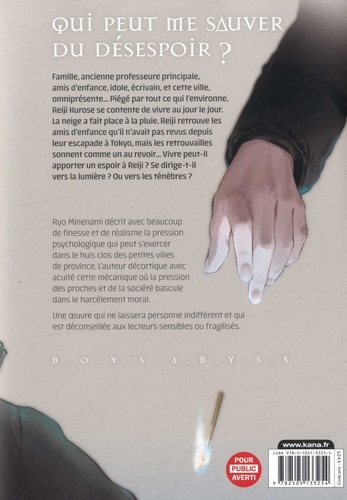 Famille, ancienne professeure principale, amis d'enfance, idole, écrivain, et cette ville, omniprésente... Piégé par tout ce qui l'environne, Reiji Rurose se contente de vivre au jour le jour. La neige a fait place à la pluie. Reiji retrouve les amis d'enfance qu'il n'avait pas revus depuis leur escapade à Tokyo, mais les retrouvailles sonnent comme un au revoir... Vivre peut-il apporter un espoir à Reiji ? Se dirige-t-il vers la lumière ? Ou vers les ténèbres ? Ryo Minenami décrit avec beaucoup de finesse et de réalisme la pression psychologique qui peut s'exercer dans le huis clos des petites villes de province. L'auteur décortique avec acuité cette mécanique où la pression des proches et de la société bascule dans le harcèlement moral. Une oeuvre qui ne laissera personne indifférent et qui est déconseillée aux lecteurs sensibles ou fragilisés.