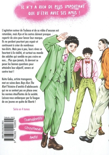 Keito Gaku, artiste transgenre, met en scène dans Boys Run The Riot l'histoire d'amitié d'adolescents qui ne se sentent pas en phase avec les normes étouffantes de la société. Laissez-vous embarquer par la fougue de ces jeunes en quête de liberté ! L'agitation autour de Tsubasa et de sa vidéo d'excuses a pris fin, mais Ryo et les autres doivent presque repartir de zéro pour lancer leur marque. En perte de vitesse, ils ne perdent pourtant pas espoir et continuent à créer de nombreux T-shirt. Mais peu à peu, leurs rêves se heurtent à la réalité, et surtout aux adultes, qui semblent ne pas croire en leur rêve... Plus que jamais, ils devront se poser les bonnes questions pour atteindre leur objectif, envers et contre tout !