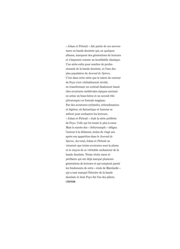 Défenseurs du Roy, de la veuve et de l'orphelin, Johan et Pirlouit s'opposent aux brigands, traîtres et autres vassaux félons qui arpentent les cours du Moyen Age. Et la malice tapageuse de l'un prend de plus en plus souvent le pas sur la combattante de l'autre. Pirlouit, personnage principal de ces aventures ? Presque... car apparaissent alors de mystérieux lutins à la peau bleue : les Schtroumpfs ! Cette intégrale comprend : La flèche noire (tome 7) Les milles écus (histoire courte) Le sire Montrésor (tome 8) Les anges (histoire courte) La flûte à six Schtroumpfs (tome 9)