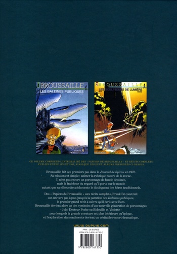 Broussaille fait ses premiers pas dans le Journal de Spirou en 1978. Sa mission est simple : animer la rubrique nature de la revue. Il n'est pas encore un personnage de bande dessinée, mais la fraîcheur du regard qu'il porte sur le monde autant que sa silhouette adolescente le distinguent des héros traditionnels. Des "Papiers de Broussaille" aux récits complets, Frank Pé construit son univers pas à pas, jusqu'à la parution des Baleines publiques, le premier grand récit à suivre qu'il écrit avec Bom. Broussaille devient alors un des symboles d'une nouvelle génération de personnages - Jojo, Docteur Poche ou Bidouille et Violette - pour lesquels la grande aventure est plus intérieure qu'épique, et l'exploration des sentiments devient un véritable ressort dramatique.