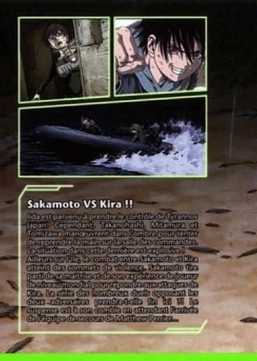 Iida est parvenu à prendre le contrôle de Tyrannos Japan. Cependant, Takanohashi, Mitamura et Tomizawa manoeuvrent dans l'ombre pour tenter de reprendre la main sur la salle des commandes. La situation dans cette dernière est explosive ! Ailleurs sur l'île, le combat entre Sakamoto et Kira atteint des sommets de violence. Sakamoto tire parti de sa maîtrise et de son expérience de joueur de niveau mondial pour répondre aux attaques de Kira. La série des nombreux duels opposant les deux adversaires prendra-t-elle fin ici ?! Le suspense est à son comble en attendant l'arrivée de l'équipe de secours de Matthew Perrier...