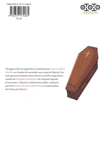 Akutagawa fait son apparition in extremis pour venir en aide à Atsushi, sur le point de succomber aux coups de Fukuchi. Les deux garçons se dressent alors devant le terrible Ange déchu, capable de centupler la puissance de n'importe laquelle de ses armes... Mais leur collaboration suffira-t-elle pour parvenir à venir à bout du célèbre héros et commandant des Chiens de Chasse ?