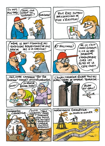 Après le cinéma, avec le "W." d'Oliver Stone, la bande dessinée s'en mêle. Treize récits surprenants sur le sort de l'Amérique et la retraite de Bush. Apocalypse sociale et politique digne d'une production hollywodienne.