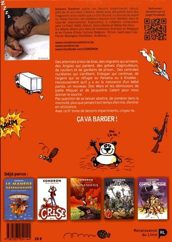Des attentats à tour de bras, des migrants qui arrivent, des Anglais qui partent, des grèves d'agriculteurs, de routiers et de gardiens de prison... Des centrales nucléaires qui s'arrêtent, Erdogan qui continue, de l'argent qui se réfugie au Panama ou à Knokke... Heureusement qu'il y a eu la naissance d'un bébé panda, un nouveau Star Wars et les démissions de Joëlle Milquet et de Jacqueline Galant pour nous donner le sourire. Pas question de se laisser abattre, de sombrer dans la morosité, plus que jamais il est temps d'en rire, d'entrer en résistance. Avec ce 6e tome de dessins impertinents, croyez-le, ça va barder !