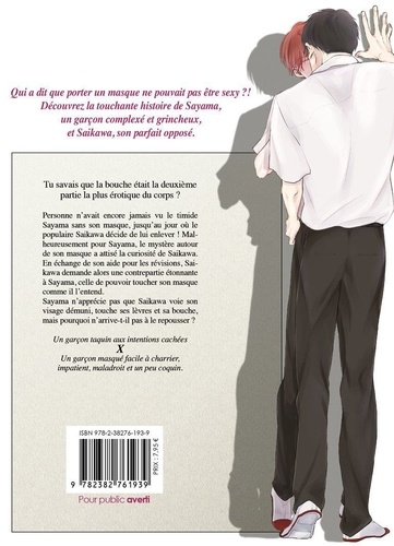 Personne n'avait encore jamais vu le timide Sayama sans son masque, jusqu'au jour où le populaire Saikawa décide de lui enlever ! Malheureusement pour Sayama, le mystère autour de son masque a attisé la curiosité de Saikawa. En échange de son aide pour les révisions, Saikawa demande alors une contrepartie étonnante à Sayama, celle de pouvoir toucher son masque comme il l'entend. Sayama n'apprécie pas que Saikawa voie son visage démuni, touche ses lèvres et sa bouche, mais pourquoi n'arrive-t-il pas à le repousser ? Qui a dit que porter un masque ne pouvait pas être sexy ? ! Découvrez la touchante histoire de Sayama, un garçon complexé et grincheux, et Saikawa, son parfait opposé.