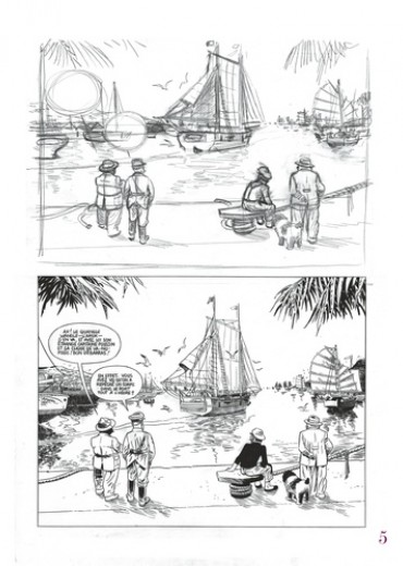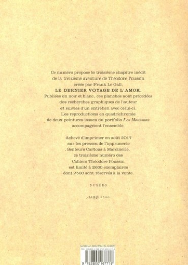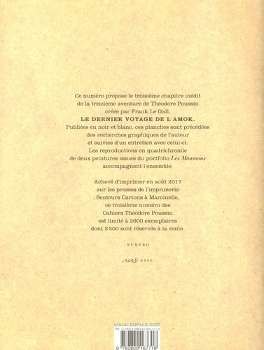 Après dix ans d'attente, Théodore Poussin reprend le large à l'automne 2018, avec une nouvelle aventure, "Le dernier voyage de l'Amok" ! Aux confins des mers du Sud, le Corto Maltese de la ligne claire, ancien employé de bureau converti à l'appel du large dans l'Asie de l'entre-deux-guerres, va se retrouver au centre de dangereuses histoires de flibusterie, d'îles oubliées et de pirates en mal de péripéties, qui vont de nouveau l'amener face à son ennemi, le capitaine Crabb. Avant même la parution de cette aventure exotique, les Editions Dupuis proposent aux lecteurs impatients et assidus de suivre, de façon trimestrielle, l'avancée du travail de Frank Le Gall. Ces cahiers graphiques présenteront chacun plusieurs planches en noir et blanc, mais également des recherches, croquis et crayonnés, ainsi qu'un dossier thématique, pour plonger plus encore dans ce retour aux sources orientales de Théodore Poussin. Dans ce troisième volet, Frank Le Gall nous dévoile notamment ses lectures de jeunesse et sa relation avec le cinéma.