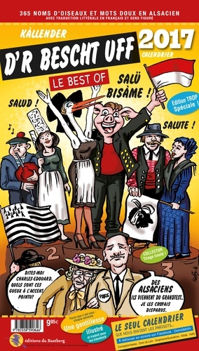 Calendrier humoristique : D'R BESCHT UFF ! L'édition à tirage limité 2017 du Lustige Kàllender de "Storchy un Hütz" 365 noms d'oiseaux et mots doux en alsacien, avec traduction littérale et sens figuré en français, truffé de gags graphiques et BD sur chaque page.