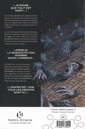 Un vaisseau d'exploitation minière parcourt l'espace, à la recherche de nouvelles ressources. Mais le voyage prend un tournant catastrophique quand un gigantesque objet non-identifié surgit de nulle part et se retrouve unifié avec le Caliban. Les survivants parcourent les deux bâtiments, désormais confondus, recherchant un moyen de regagner la Terre. Hélas pour eux, leur plongée dans l'horreur ne fait que commencer. Une menace venue des temps anciens s'emploie à faire de nouvelles victimes... Lorsque la science-fiction sombre dans l'horreur... Caliban est un récit fascinant, angoissant et labyrinthique renvoyant aux atmosphères de H.P. Lovecraft, Clive Barker ou aux longs-métrages de la saga Alien. Un titre de genre parfaitement maîtrisé par Garth Ennis (The Boys, Preacher) et Facundo Percio (Fashion Beast, Anna Mercury).