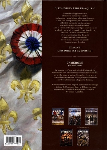 Quatrième volet de la série historique en cinq tomes indépendants scénarisés par Thierry Gloris. Leur lien, une bataille marquante. Chacune illustrera à sa manière la question suivante : que signifie " être français " ? La bataille dite de Camerone (30 avril 1863) correspond au massacre d'une poignée de légionnaires retranchés face à une armée mexicaine déchaînée. Relativement obscur et secondaire à l'époque, cet engagement de quelques dizaines de personnes deviendra un mythe pour la légion étrangère. Il est perçu comme la quintessence de l'esprit guerrier et du sacrifice ultime face à la parole donnée.