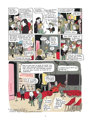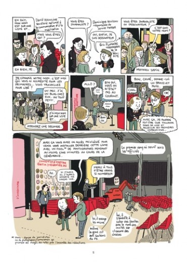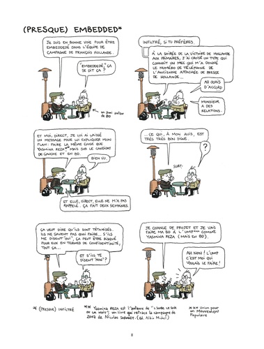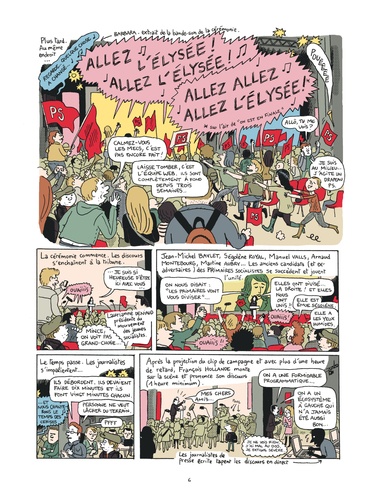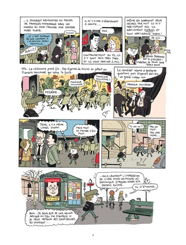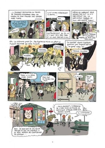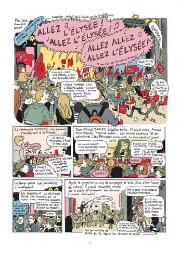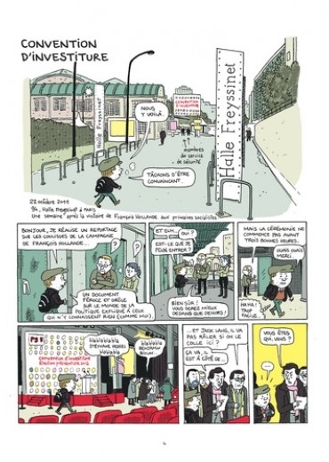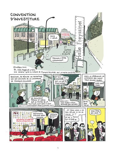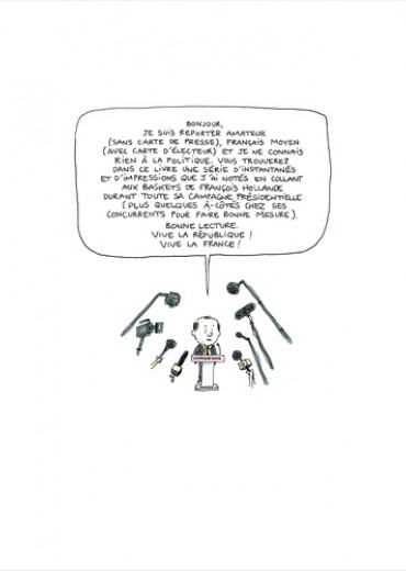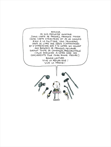 Depuis octobre 2011, Mathieu Sapin accompagne François Hollande pendant sa campagne, au plus près du candidat. Réunions stratégiques, déplacements, meetings et confidences exclusives : le BD reporter livre un document passionnant sur les coulisses d’une campagne présidentielle à nulle autre pareille. Après Feuille de chou, Journal d’un tournage et Journal d’un journal (Editions Delcourt), ce spécialiste du reportage dessiné s’attaque à la vie politique et à ses coutumes secrètes.