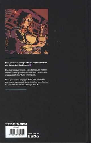 Bienvenue chez Omega Zeta Nu, la plus infernale des fraternités étudiantes. Une énigmatique femme à tête de lapin, un homme qui dévore une grenouille vivante, des incantations mystiques et des rituels sataniques... Vous qui tournez les pages de ce livre, oubliez ce que vous croyez savoir des universités américaines. Ici s'ouvrent les portes d'Omega Zeta Nu.