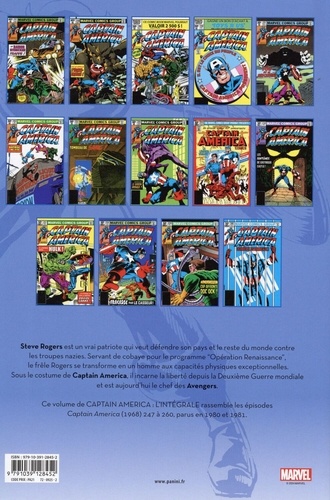 Steve Rogers est un vrai patriote qui veut défendre son pays et le reste du monde contre les troupes nazies. Servant de cobaye pour le programme "Opération Renaissance", le frêle Rogers se transforme en un homme aux capacités physiques exceptionnelles. Sous le costume de Captain America, il incarne la liberté depuis la Deuxième Guerre mondiale et est aujourd'hui le chef des Avengers. Ce volume de Captain America : L'Intégrale rassemble les épisodes Captain America (1968) 247 à 260, parus en 1980 et 1981.