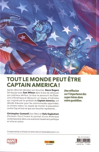 Après s'être fait dérober son bouclier, Steve Rogers fait équipe avec Sam Wilson dans le but de retrouver son précieux attribut. Le duo va parcourir les Etats-Unis d'Amérique et découvrir un réseau d'individus qui, inspirés par le symbole de Captain America, ont décidé d'oeuvrer pour les communautés opprimées. Le sinistre voleur, lui, essaie de monter la population contre Cap et tout ce que son bouclier représente... Christopher Cantwell (Iron Man) et Dale Eaglesham (Fantastic Four) livrent le portrait d'une Amérique contemporaine dans une aventure hautement politique et riche en action.