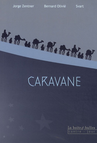 " Caravane nous entraîne, à la suite des guides et des chameliers, dans un voyage hors du temps et du monde, sans point de départ ni but apparent, dans un espace qui défie les frontières du rêve et du cauchemar, du jour et de la nuit... Les couleurs du désert se mêlent à l'obscurité la plus profonde pour faire de cette déambulation au rythme du pas des chameaux un parcours initiatique, une exploration avant tout intérieure. Six ans après sa première édition en noir et blanc (éditions Fremok), cette oeuvre née sous la plume de l'immense Jorge Zentner et mise en images, poétiques voire hypnotiques, par Bernard Olivié, se pare enfin de couleurs, selon le désir originel de ses créateurs. On lit ce récit le nez dans tes étoiles et les yeux comme aimantés aux mots de Zentner. (...) Un livre qu'on relirait bien une fois la dernière page tournée ". Thierry Bellefroid.