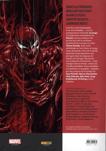 Il est fou, il est impitoyable, il est incontrôlable... et il est pratiquement immortel. Carnage, la progéniture malveillante de Venom, est une créature née du lien qui unit le symbiote extraterrestre au tueur en série Cletus Kasady. Avec cette anthologie en noir, blanc et rouge sang, de grands noms de la bande dessinée contemporaine nous plongent dans les abysses de l'esprit de Carnage. Découvrez une avalanche d'aventures - entre voyages dans le temps, visions de mondes parallèles, futurs possibles et révélations incroyables - réalisées par des auteurs de la trempe de Sara Pichelli, Marco Checchetto, Chip Zdarsky, Kyle Hotz, Greg Smallwood, Al Ewing et bien d'autres.