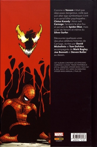Au programme de cet album : trois rencontres cultes du psychopathe Cletus Kasady, alias Carnage, avec Spider-Man ! Ces affrontements sont signés par les plus grands auteurs du Tisseur comme David Michelinie, Tom DeFalco et Mark Bagley. Tandis que le film Venom 2, mettant en scène Carnage, sort le 25 juin dans les salles obscures, les lecteurs pourront découvrir ce volume one-shot contenant trois récits complets.