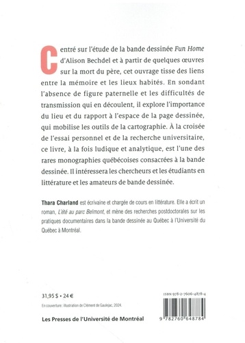 Centré sur l'étude de la bande dessinée Fun Home d'Alison Bechdel et à partir de quelques oeuvres sur la mort du père, cet ouvrage tisse des liens entre la mémoire et les lieux habités. En sondant l'absence de figure paternelle et les difficultés de transmission qui en découlent, il explore l'importance du lieu et du rapport à l'espace de la page dessinée, qui mobilise les outils de la cartographie. A la croisée de l'essai personnel et de la recherche universitaire, ce livre, à la fois ludique et analytique, est l'une des rares monographies québécoises consacrées à la bande dessinée. Il intéressera les chercheurs et les étudiants en littérature et les amateurs de bande dessinée.