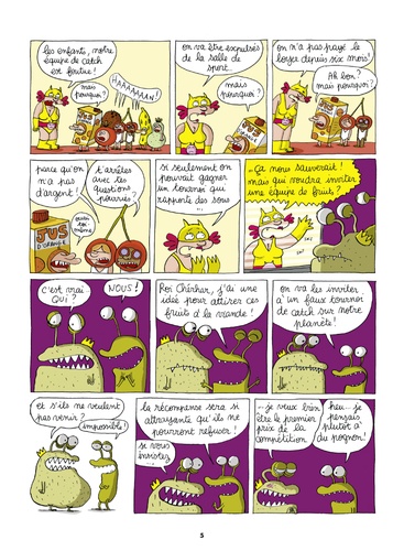 Quelque part au fin fond de la galaxie, le roi Cherhar pousse des cris de douleurs ! Seul remède préconisé par ses médecins : des fruits ! Son fidèle (et unique) sujet lui apprend qu'on en trouve une multitude sur la Terre. Mais le roi n'aime que la viande Scrutant la Terre, ils tombent par hasard sur une équipe de catch constituée d'enfants déguisés en fruits ! Pour les attirer, les deux extra-terrestres inventent un match intergalactique de catch ! Sans le savoir, la joyeuse troupe de Nini, chipie entourée d'un homme préhistorique décongelé, d'un canard et d'un monstre violet, Patalo, va tomber dans le piège. Mais dans l'univers de Nini, rien ne se passe jamais comme prévu ! Embarquée en douce dans le doigt-vaisseau en lequel s'est m étamorphosé Patalo, propulsée dans les étoiles par la maladresse de son ami canard, voilà Nini en route vers des aventures aussi inattendues qu'amusantes.
