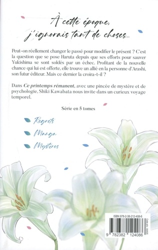 Peut-on réellement changer le passé pour modifier le présent ? C'est la question que se pose Haruta depuis que ses efforts pour sauver Yukishima se sont soldés par un échec. Profitant de la nouvelle chance qui lui est offerte, elle trouve un allié en la personne d'Arashi, son futur éditeur. Mais ce dernier la croira-t-il ? Dans Ce printemps rémanent, avec une pincée de mystère et de psychologie, Shiki Kawabata nous invite dans un curieux voyage temporel.