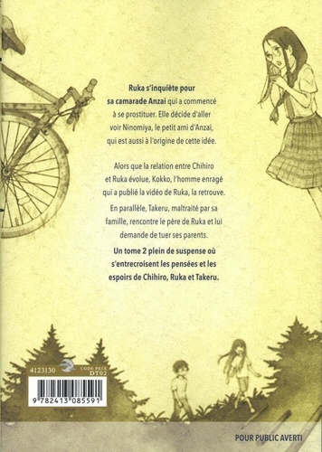 Ruka s'inquiète pour sa camarade Anzai qui a commencé à se prostituer. Elle décide d'aller voir Ninomiya, le petit ami d'Anzai, qui est aussi à l'origine de cette idée. Alors que la relation entre Chihiro et Ruka évolue, Kokko, l'homme enragé qui a publié la vidéo de Ruka, la retrouve. En parallèle, Takeru, maltraité par sa famille, rencontre le père de Ruka et lui demande de tuer ses parents. Un tome 2 plein de suspense où s'entrecroisent les pensées et les espoirs de Chihiro, Ruka et Takeru.
