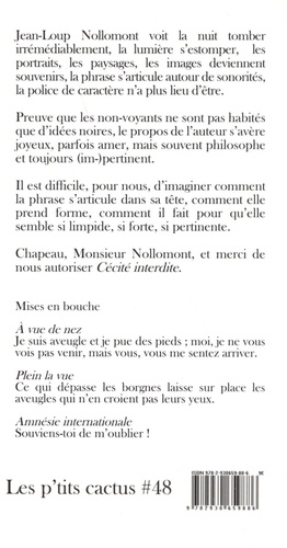 Jean-Loup Nollomont voit la nuit tomber irrémédiablement, la lumière s'estomper, les portraits, les paysages, les images deviennent souvenirs, la phrase s'articule autour de sonorités, la police de caractère n'a plus lieu d'être. Preuve que les non-voyants ne sont pas habités que d'idées noires, le propos de l'auteur s'avère joyeux, parfois amer, mais souvent philosophe et toujours (im-)pertinent. Il est difficile, pour nous, d'imaginer comment la phrase s'articule dans sa tête, comment elle prend forme, comment il fait pour qu'elle semble si limpide, si forte, si pertinente. Chapeau, Monsieur Nollomont, et merci de nous autoriser Cécité interdite. Mises en bouche A vue de nez Je suis aveugle et je pue des pieds ; moi, je ne vous vois pas venir, mais vous, vous me sentez arriver. Plein la vue Ce qui dépasse les borgnes laisse sur place les aveugles qui n'en croient pas leurs yeux. Amnésie internationale Souviens-toi de m'oublier !