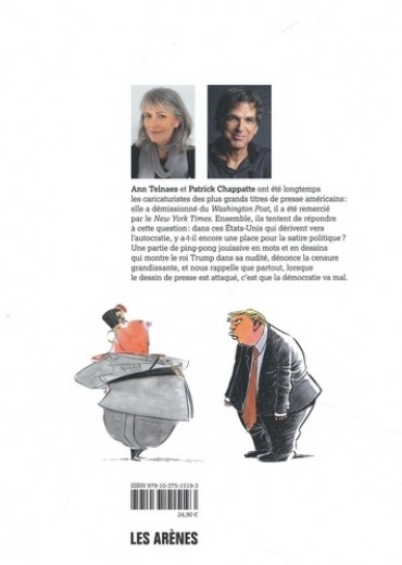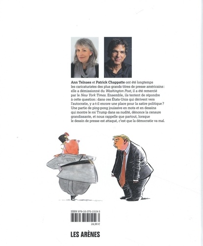 Ann Telnaes et Patrick Chappatte ont été longtemps les caricaturistes des plus grands titres de presse américains : elle a démissionné du Washington Post, il a été remercié par le New York Times. Ensemble, ils tentent de répondre à cette question : dans ces Etats-Unis qui dérivent vers l'autocratie, y a-t-il encore une place pour la satire politique ? Une partie de ping-pong jouissive en mots et en dessins qui montre le roi Trump dans sa nudité, dénonce la censure grandissante, et nous rappelle que partout, lorsque le dessin de presse est attaqué, c'est que la démocratie va mal.