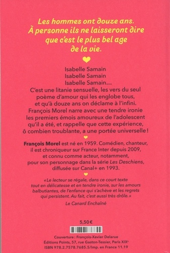 Les hommes ont douze ans. A personne ils ne laisseront dire que c'est le plus bel âge de la vie. Isabelle Samain Isabelle Samain Isabelle Samain... C'est une litanie sensuelle, les vers du seul poème d'amour qui les englobe tous, et qu'à douze ans on déclame à l'infini. François Morel narre avec une tendre ironie les premiers émois amoureux de l'adolescent qu'il a été, et rappelle que cette expérience, ô combien troublante, a une portée universelle !