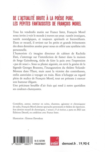 De l'actualité brute à la poésie pure, les pépites fantaisistes de François Morel. Tous les vendredis matin sur France Inter, François Morel nous invite à voir le monde à travers ses yeux : tantôt ironiques, tantôt nostalgiques, et toujours spirituels et bienveillants. Dans ce recueil, il revient sur les petits et grands événements des deux dernières années pour nous en offrir une synthèse très personnelle. L'humoriste s'y imagine directeur de cabinet de Rachida Dati, s'interroge sur l'interdiction de fumer dans la maison de Serge Gainsbourg, tâche de faire la paix avec l'expression "pas de soucis". Sous sa plume aiguisée, on revit la genèse de la légende Georges Brassens, l'inauguration du théâtre Yolande Moreau dans l'Eure, mais aussi la victoire des contrebasses, enfin autorisées à voyager en train. Rien n'échappe au regard plein de malice de François Morel, tout est prétexte à exercer son humour élégant. Une précieuse bouffée d'air frais qui rend à notre quotidien ses couleurs chatoyantes.