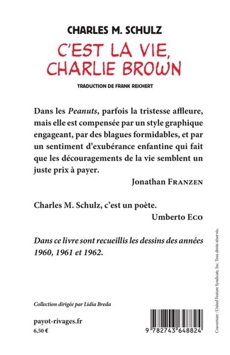 "Dans les Peanuts, parfois la tristesse affleure, mais elle est compensée par un style graphique engageant, par des blagues formidables, et par un sentiment d'exubérance enfantine qui fait que les découragements de la vie semblent un juste prix à payer." Jonathan Franzen. "Charles M. Schulz, c'est un poète." Umberto Eco. Dans ce livre sont recueillis les dessins des années 1960, 1961 et 1962.