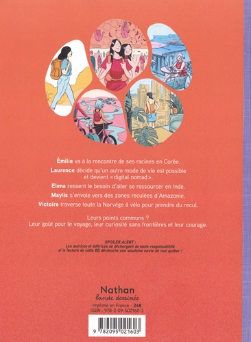 " Un jour, je remplirai ma valise pour voyager "pour de vrai". " Une BD qui aborde le thème du dépassement de soi tout en sensibilisant aux enjeux contemporains : écologie, féminisme, relations interculturelles, solitude, aventure... Pourquoi partir ? Se retrouver ? Vivre différemment ? Découvrir ses origines ? Apprendre et se sentir utile ? Rompre avec la routine ? Cinq femmes qui ont fait le choix de partir et de revenir nous entraînent dans le sillage de leur voyage à travers un road-BD inspirant ! Césure est une réflexion sur le voyage à travers les parcours croisés de cinq femmes. Chacune a ses raisons de vouloir partir et en revient transformée. Découpés en 6 chapitres, les portraits d'Emilie, Laurence, Maylis, Elena et Victoire, évoquent successivement leur jeunesse, la préparation de leur périple, la communication et leurs difficultés sur place et enfin le retour . Cette BD replace les femmes au coeur de leurs initiatives, les confrontent à leurs difficultés tout en les réconciliant avec leurs origines, leurs familles et elles-mêmes.