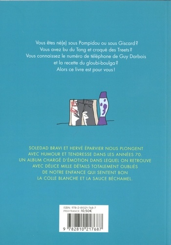 Vous êtes né(e) sous Pompidou ou sous Giscard ? Vous avez bu du Tang et croqué des Treets ? Vous connaissez le numéro de téléphone de Guy Darbois et la recette du gloubi-boulga ? Alors ce livre est pour vous ! Soledad Bravi et Hervé Eparvier nous plongent avec humour et tendresse dans les années 70. Un album chargé d'émotion dans lequel on retrouve avec délice mille détails totalement oubliés de notre enfance qui sentent bon la colle blanche et la sauce béchamel.