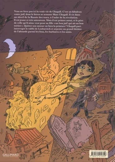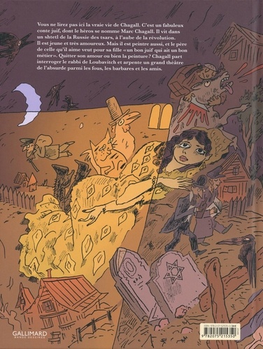 Un conte librement inspiré de la vie de Marc Chagall. Vous ne lirez pas ici la vraie vie de Chagall. C'est un fabuleux conte juif, dont le héros se nomme Marc Chagall. Il vit dans un shtetl de la Russie des tsars, à l'aube de la Révolution. Il est jeune et très amoureux. Mais il est peintre aussi, et le père de celle qu'il aime veut pour sa fille "un bon juif qui ait un bon métier". Quitter son amour ou bien la peinture ? Chagall part interroger le rabbi de Loubavitch et arpente un grand théâtre de l'absurde parmi les fous, les barbares et les amis.